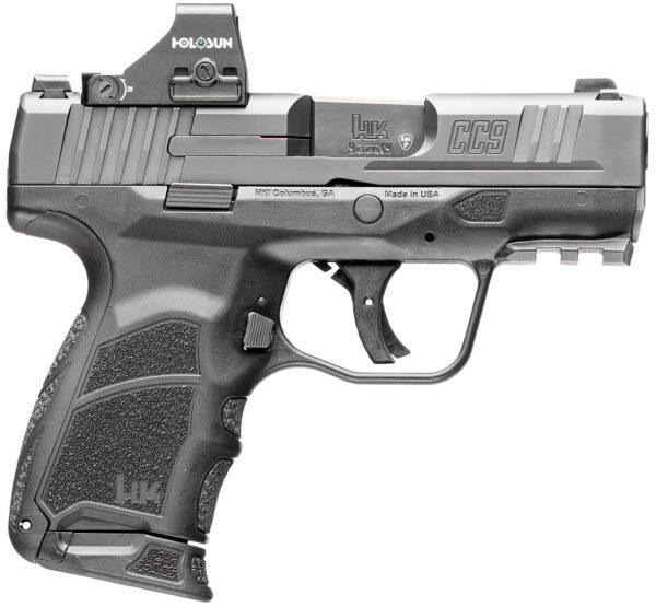 The CC9 is HKs smallest double-stack handgun. Its small features mirrored ambidextrous controls; picatinny-style rail; optics-ready featuring an RMSc/407k footprint; 5lb trigger has a crisp wall and reset; factory included night-sight and a grip with two interchangeable backstraps. Includes 10rd and 12rd magazine.