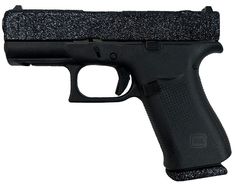 GlitterGunz is a durable sparkling coating applied utilizing specialized equipment and a patent-pending process. The slight tactile texture of the coating provides the user with a non-slip grip making it easier to operate a semiauto handgun””s slide.