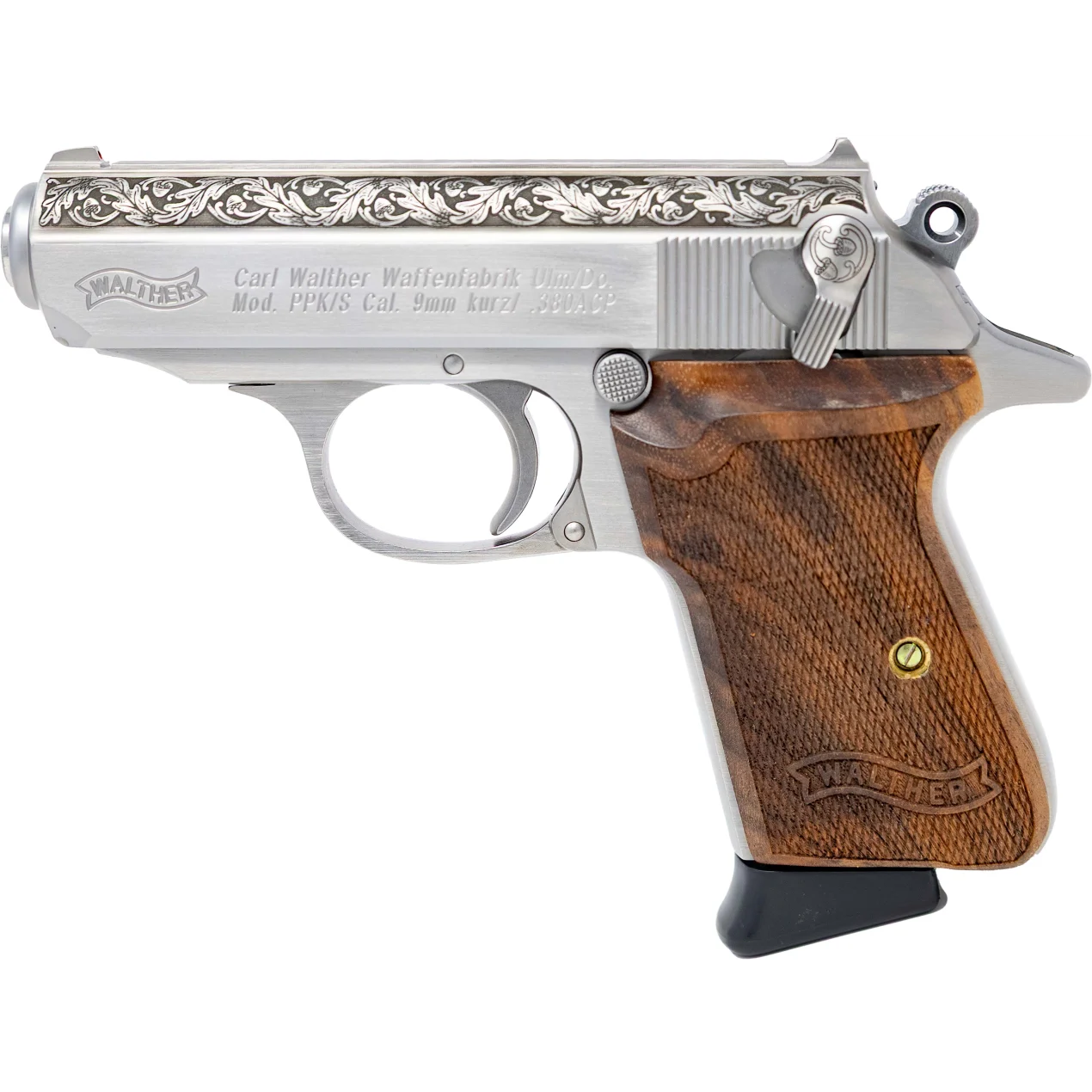 Manufacturer: Walther Model: PPK/S Stainless Oak Leaf Type: Pistol Caliber: 380Auto Condition: New
